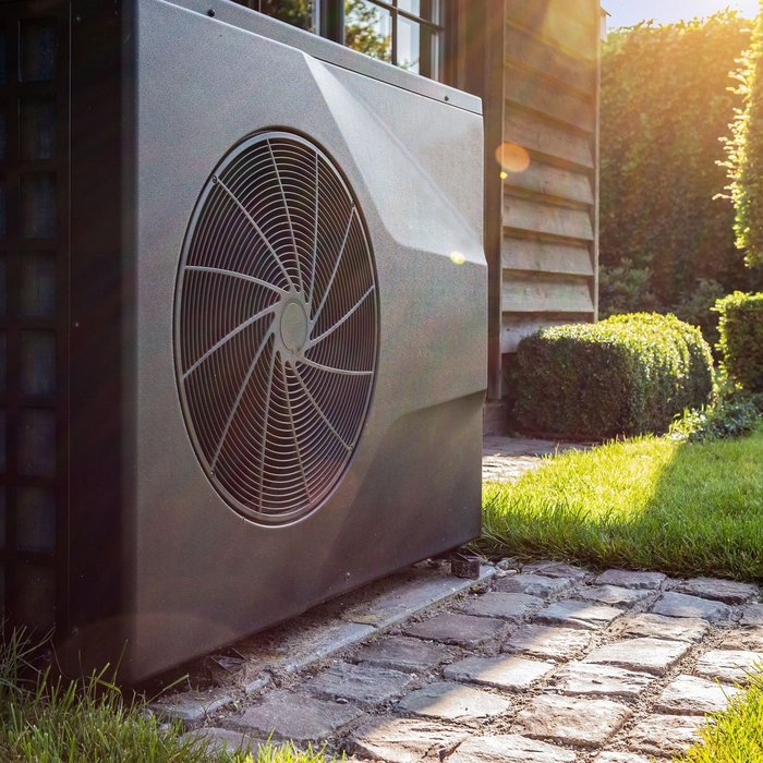Außenaufgestellte Wärmepumpe neben einem Haus mit gepflegtem Garten und Sonnenschein
